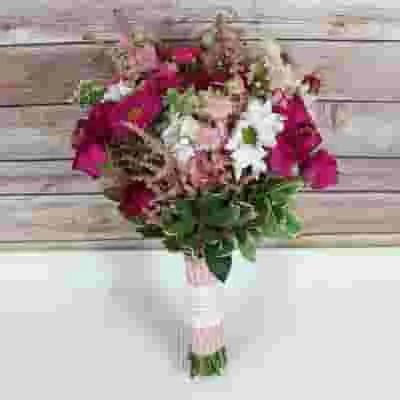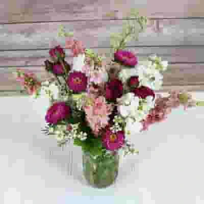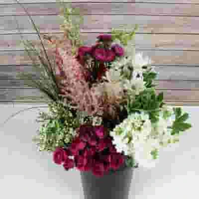 Blooms Classy Thinkin’ Pink Wildflower Pack contains: 21 stems of white pompon daisies, 30 stems of pink astilbe, 30 stems of larkspur, 20 stems of spray roses, 20 stems of matsumoto asters, 20 stems of stock, 20 stems of wax flower, 30-40 stems of pittosporum, and 90-100 stems of bear grass.