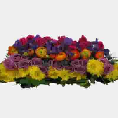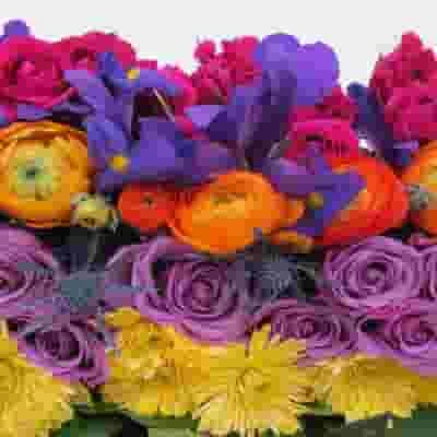A single pack will contain; 50 stems of rose cool water, 20 stems of iris purple, 30 stems of orange ranunculus, 21 stems of yellow pompon cushions, 15 stems of thistle, 20 stems of sword fern, approx. 32-36 stems of lemon papoose, 30 stems of hot pink spray roses.