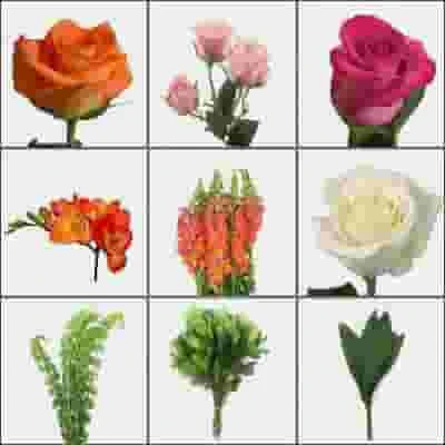 Orange & Pink DIY Wedding Flower Pack contains: 50 stems of orange roses, 30 stems of pink spray roses, 50 stems of hot pink roses, 30 stems of freesia orange, 30 stems of snapdragon orange, 50 stems of white roses, 30 stems of bells of Ireland, approx. 45-60 stems of pittosporum and 20 stems of aspidistra.