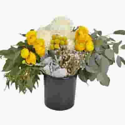 Bright and cheery yellow and subtle yet sophisticated grey come to life in Pantone’s 2021 color of the year flower pack. With ultimate grey represented by dusty miller, a soft and delicate filler. Silver brunia is a dried flower with a quirky look that blends beautifully with the yellow shades in this pack. Your choice between yellow or white football mums decides how yellow you’d like this pack to be. Yellow ranunculus and billy balls bring a sense of whimsy to this assortment of blooms. Lastly, eucalyptus is the perfect green to tie it all together with greyish, green shades and your choice of seeded or silver dollar eucalyptus.