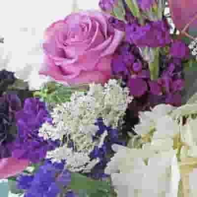 Pantone Ultra Violet Flower Pack: 25 stems of lavender roses, 10 stems of white hydrangeas, 40 stems of carnations, 20 stems of stock, 20 stems of statice, 20 stems of Queen Anne’s lace, and approx. 18-20 stems of silver dollar eucalyptus.