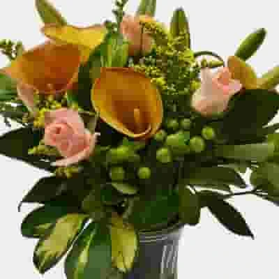 This vibrant bouquet contains green, orange and a hint of peach! With calla lilies, hypericum, lilies, roses, and solidago this sweet bouquet can brighten up anyone’s day! Choose to send a hand-tied bouquet of fresh flowers for any occasion! All bouquets are shipped overnight to guarantee freshness, you can choose your delivery date at checkout!