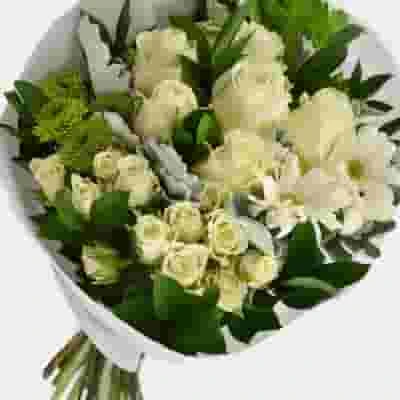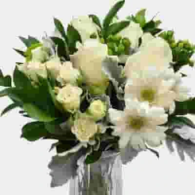 Add a smile to a special someone by sending them this lovely light white premade flower bouquet. The soft white flower combination of roses, spray roses, gerbera daisies, green hypericum, dusty miller and mixed greens will bring a smile to someone’s face and make them feel special. Order this bouquet and send flowers as a gift to a friend or family member for a Birthday, Mother’s Day, Grandparents Day, Valentines’ Day, Anniversary or any holiday you celebrate! These flowers will make anyone happy!