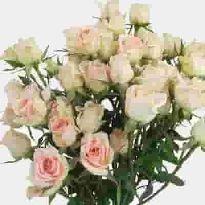 Chablis spray roses are a creamy color on the outside with soft blush peachy-pink coloring. These roses will add a stunning vintage look to any wedding bouquet, centerpiece, and flower arrangements. Spray roses are smaller roses, with smaller flowers that grow multiple blooms per stem, rather than other types of rose bushes that grow with a single flower per stem. This Chablis spray rose is a popular flower for corsages and boutonnieres, thanks to its beauty and delicacy. Chablis spray roses will vary in color. Use in long-stem rose arrangements or bouquets are beauties, as they create variety for greater visual interest.